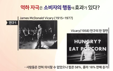 역하 지각에 대한 실험에서 Vicary(1958)은 영상 중간중간마다 1/300초씩 "Eat Pop Corn Drink Coca-cola"를 삽입하였는데, 사람들은 전혀 의식할 수 없었으나 팝콘과 콜라의 판매량이 증가했음을 보여주었다. 역하지각의 효과에 대한 실효성은 연구마다 다른 결과를 보여주었지만, Hawkins(1970)의 2.7/1000초 씩 단어 "COKE"를 제시한 실험의 결과로 미루어보았을 때, 역하자극은 제품선호를 유발시키지 않지만 배고픔이나 목마름같은 기본적인 욕구를 유발한다고 결론을 내렸다.