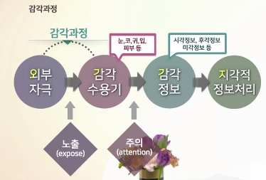 외부자극에 있는 자극들은 소비자의 감각기관(눈, 코, 귀, 피부)와 같은 감각기관을 통해서 들어오게된다. 이렇게 들어온 자극은 신경 신호로 변환되어 정보를 받아들이게 되는데, 이 과정에서 개인이 그 자극에 "주의(Attention)"을 기울어야 정보처리과정으로 넘어가게 된다.